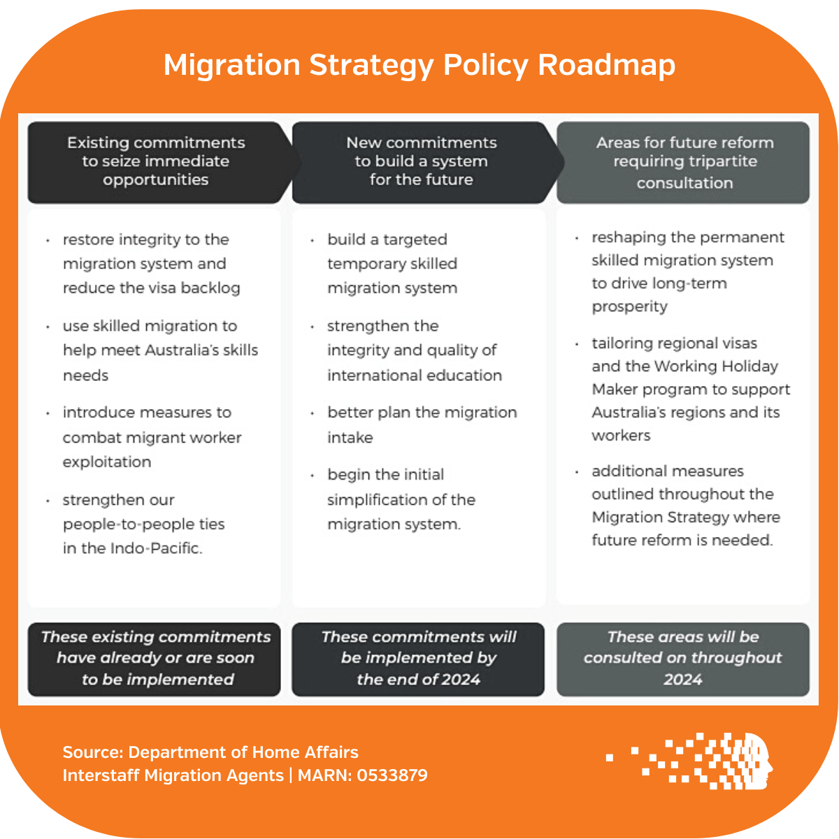 The Government will deliver its Migration Strategy in 3 stages of reform as per the below Policy Roadmap. Some commitments have already been implemented, while others will either be implemented by the end of 2024 or consulted on in 2024.