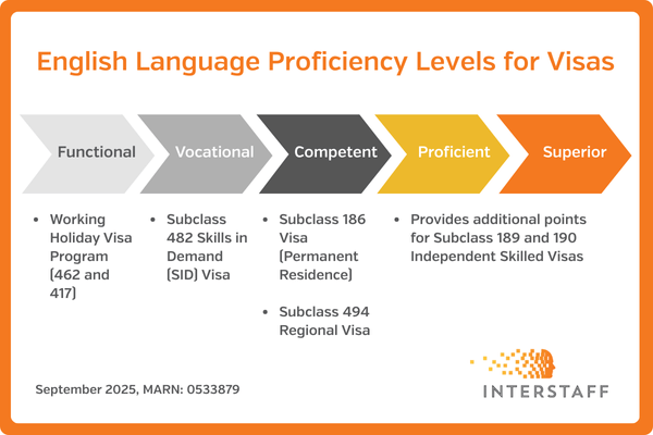 English Requirements for Visas | Disclaimer | This content is not advice. It serves as a general overview of topics of interest. It is not exhaustive, and its accuracy is subject to change. Interstaff is not responsible for the accuracy or timeliness of the information or any actions taken based on it. We recommend that you seek professional advice before making decisions or relying on the information provided – please enquire with our team of Registered Migration Agents for specialist advice so that your specific circumstances can be considered.