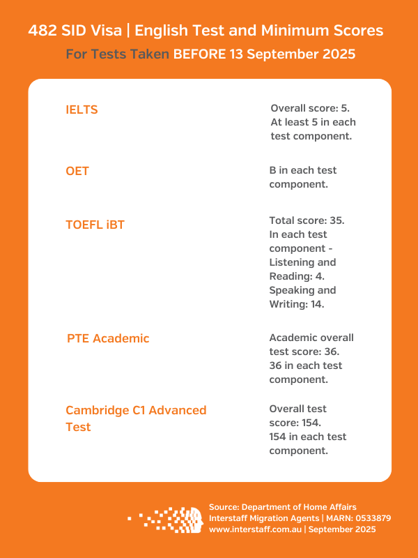 - For the 482 SID Visa – New English requirements came into effect on 13 September 2025.