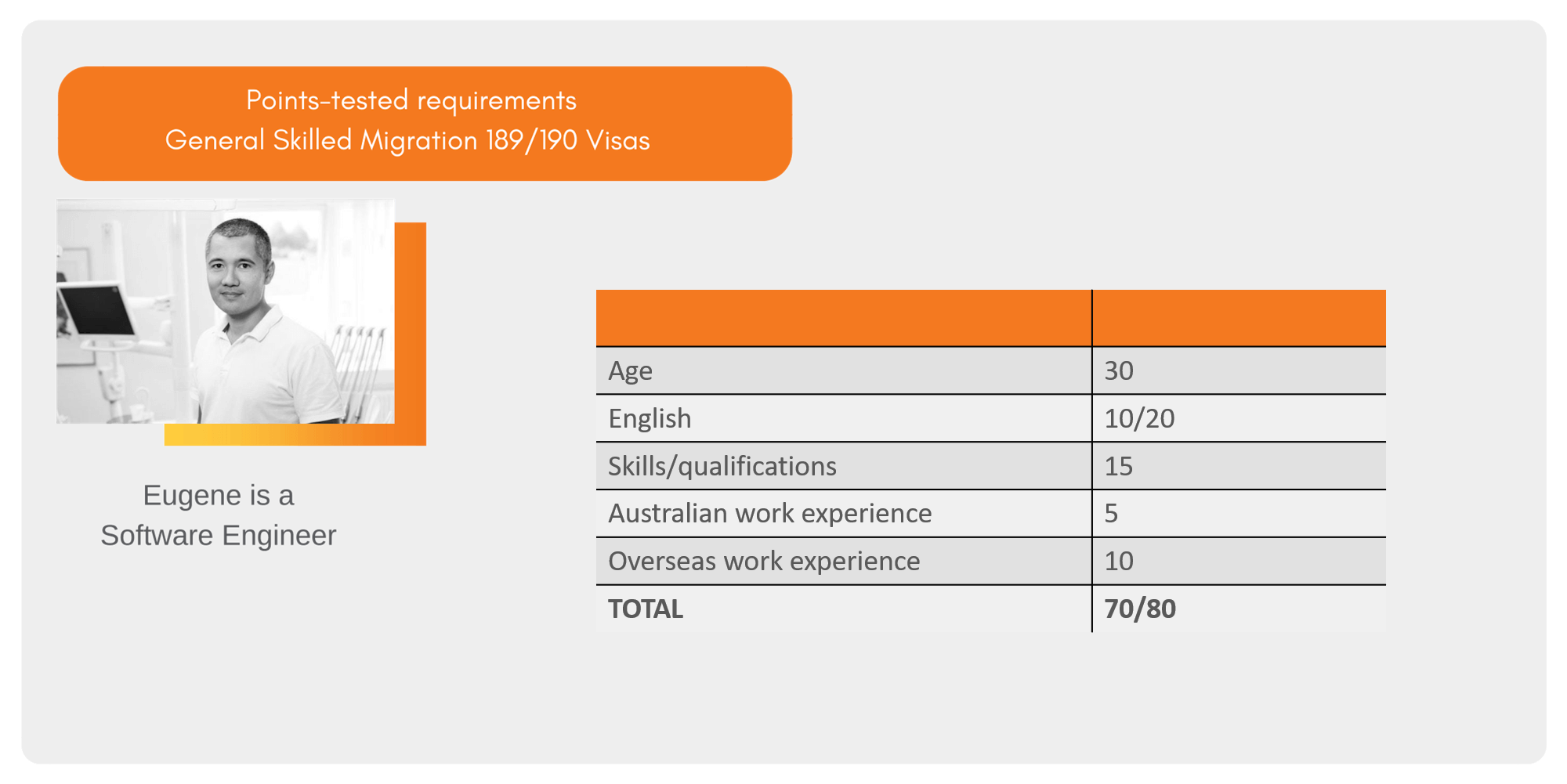 Let’s take an example. Eugene is a thirty year old British software developer with five years’ work experience overseas who has already been working with an Australian business on a 482 in Australia for one year and his points would apply in this way. Eugene’s points for English could change depending on his English test results, which is why the numbers differ below. Eugene could obtain a skills assessment in three months and obtain an invitation to apply for the visa within six months. After a further 11 months the visa could be finalised.