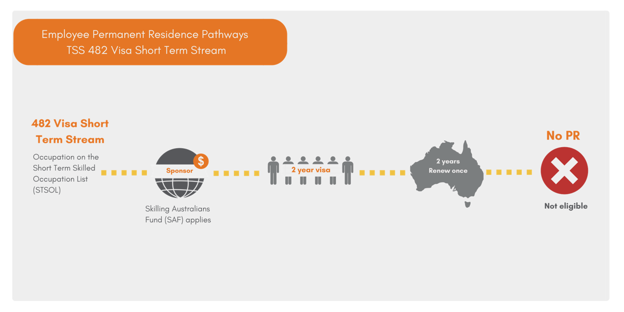 The TSS Short Term stream introduces a guest-worker concept to Australia’s employer sponsored visa program whereby applicants can obtain a work visa for 2 years but only extend it once – for a further two years – and are excluded from permanent residence pathways.