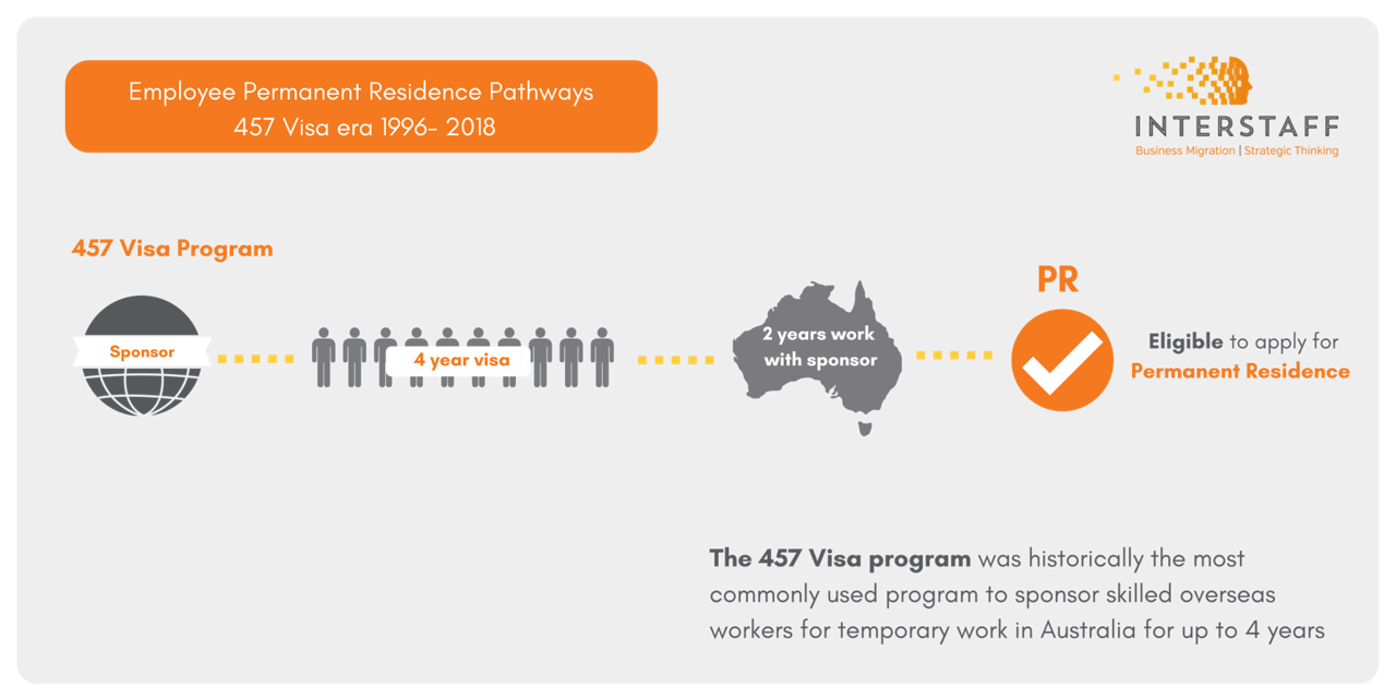 For the past twenty years, Australia’s working visa program provided a range of visa options that gave relative certainty for employees to transition to permanent residence when sponsoring international workers on temporary visas. As you can see below, a typical path involved a business sponsoring a skilled worker on usually a four year working visa with the certainty of permanent residence availability after two years of employment within the business.