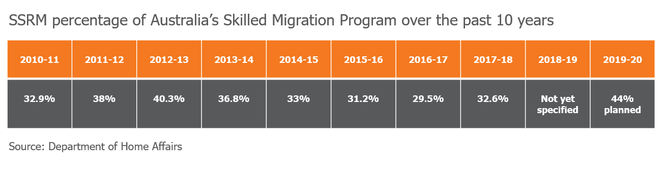 SSRM figures for 2018/19 are yet to be released, however over the past ten years, the SSRM percentage of the total skilled migration program has historically only peaked at 40.3 per cent in 2012-13. Since this peak, the SSRM percentage has generally remained stable at around 30%.