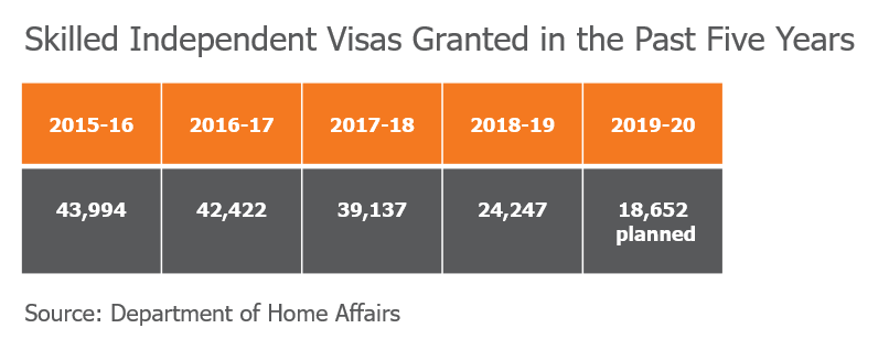 This is particularly the case for skilled migrants applying independently without an employer sponsor through the General Skilled Migration program. Only 18,652 Skilled Independent placements have been planned for 2019/20, compared to 24,247 Skilled Independent Visas granted in 2018-19. Skilled Independent Visas enable migrants to live and work in any area of Australia.
