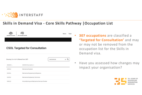 - Keeping your eyes peeled for updates on upcoming visa changes – for example, the commencement of the Skills in Demand Visa. Sign up for Interstaff’s newsletter, e-guide and insights at www.interstaff.com.au/visa-tools-for-employers/