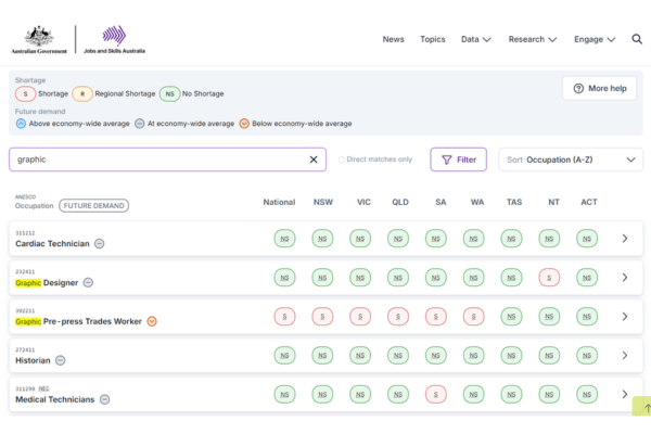 Jobs and Skills Australia has developed a Skills Priority List to track skills in shortage across the economy. Below you can see a snapshot of part of the Skills Priority List. It will be interesting to see how agile and responsive Jobs and Skills Australia will be to changes in the labour market and the economy.