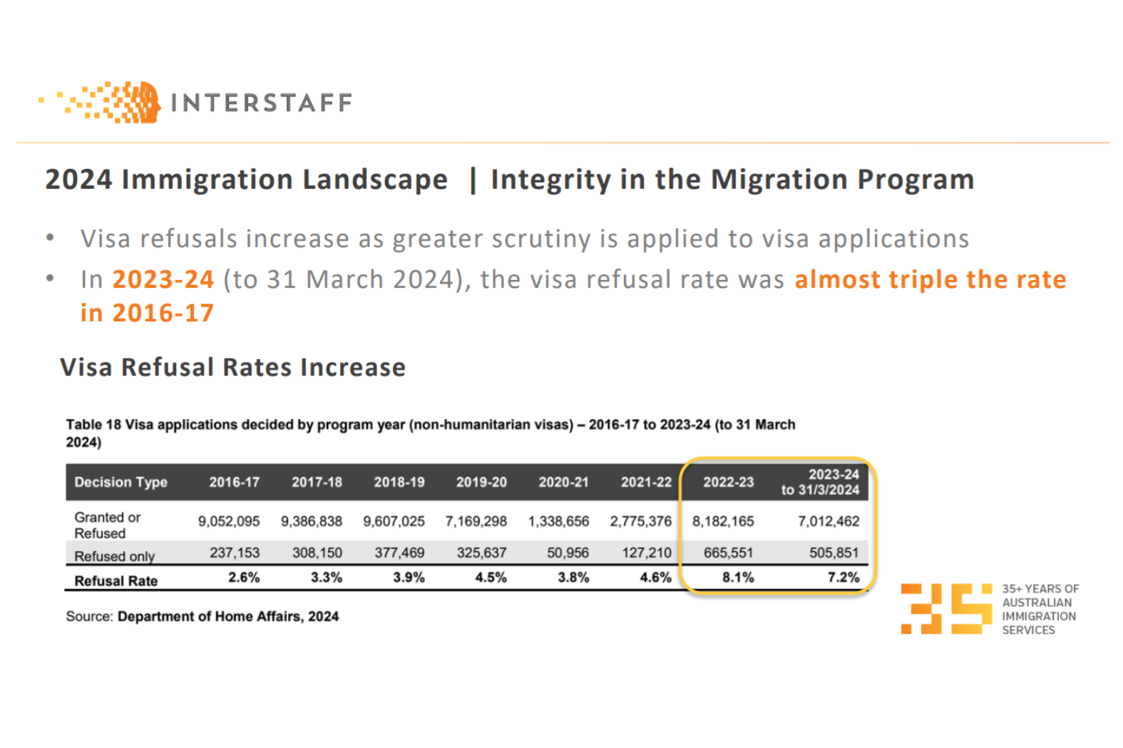 - Keeping your eyes peeled for updates on upcoming visa changes – for example, the commencement of the Skills in Demand Visa. Sign up for Interstaff’s newsletter, e-guide and insights at www.interstaff.com.au/visa-tools-for-employers/