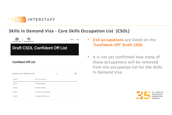 Jobs and Skills Australia will provide final advice to the Government on the proposed final CSOL, but it is worth noting that some skills that have previously been supplemented by the skilled migration program have been flagged for removal, such as IT Support roles.