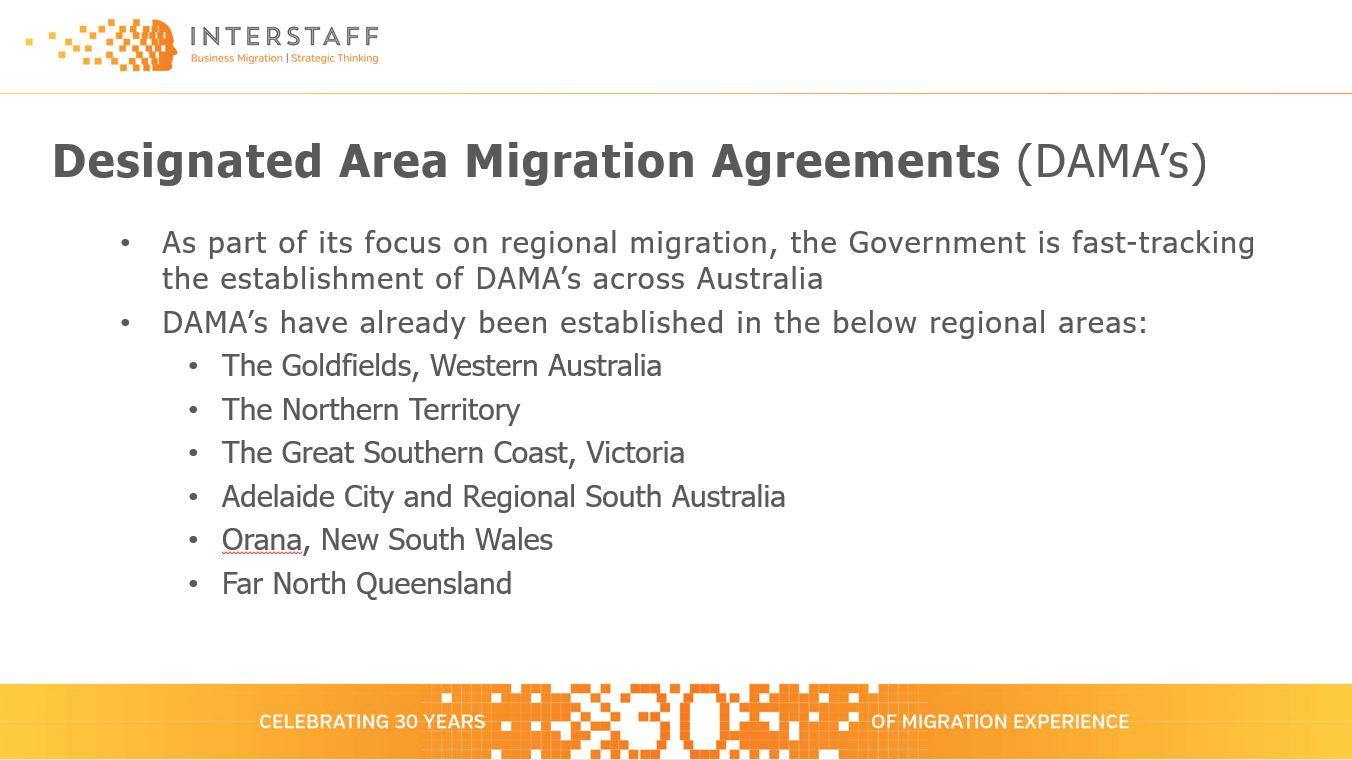 These migration arrangements provide employers a five year period to sponsor overseas workers with agreed concessions for skill level, occupations and salary levels. It may be an option for eligible businesses with operations in a DAMA area.
