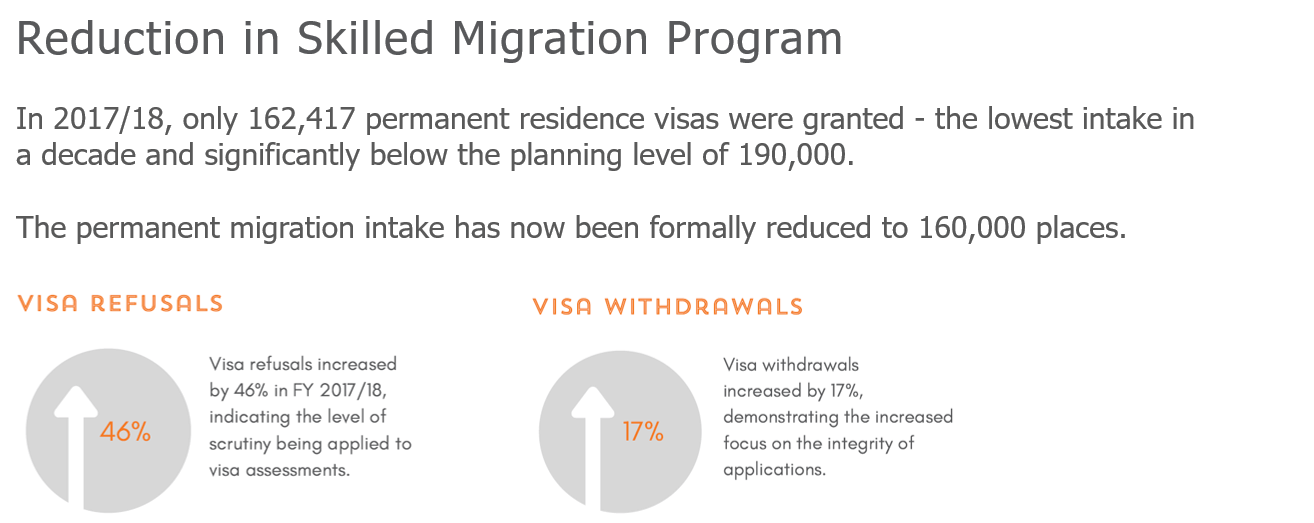This year, the Government formalised further restrictions to Australia’s migration program by reducing the permanent migration intake by 30,000 people per year. Australia’s permanent migration intake is now set at 160,000 people per year for the next four years, with 23,000 of those placements becoming available for new Regional Skilled Visas commencing in November 2019.