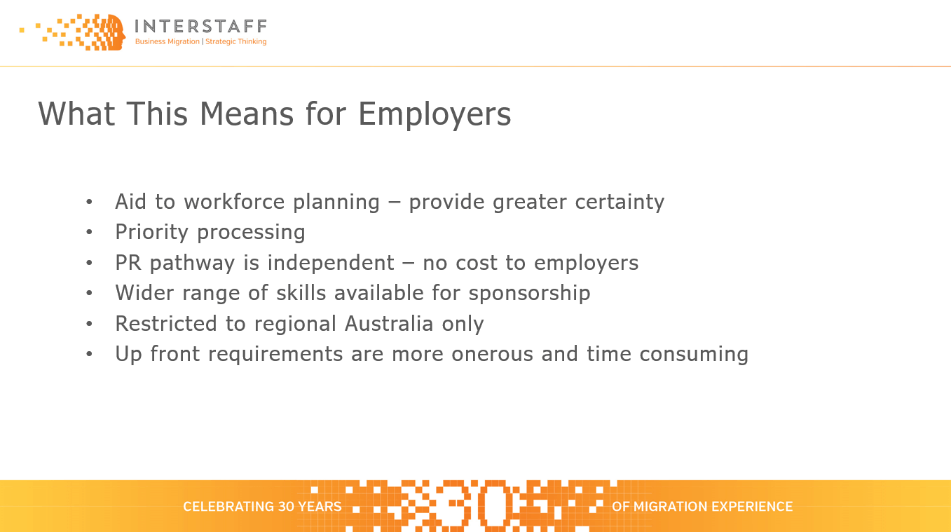 There is a level of complexity involved in sponsoring under the new visa and employers will be required to obtain support from a regional certifying body. Skills assessments and other requirements will also need to be obtained to satisfy rigorous visa requirements.