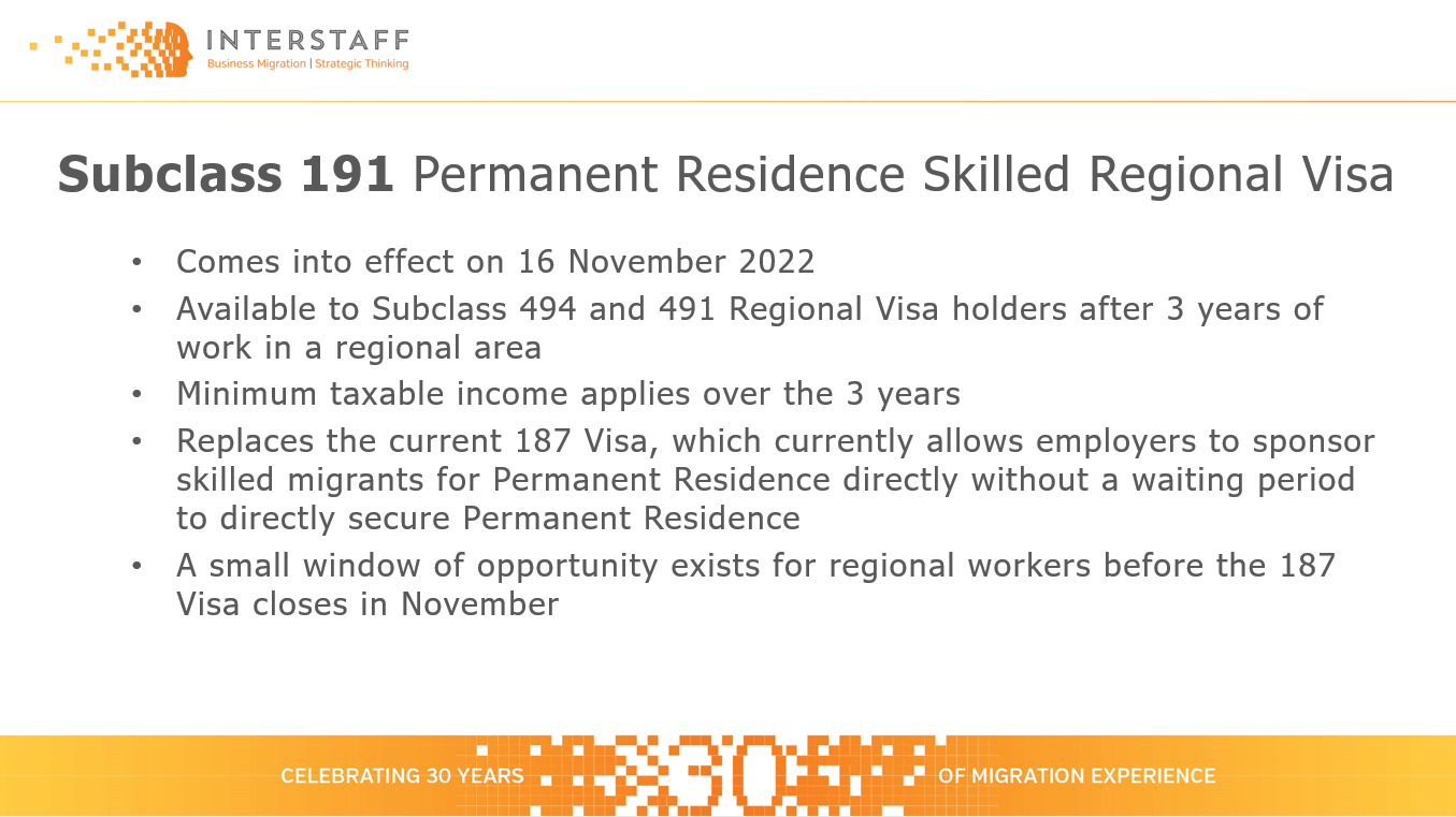 The new 191 Visa will become available from November 2022 as a permanent residence visa option for skilled migrants on a Subclass 491 or 494 Regional Visa who have worked in a regional area for three years.